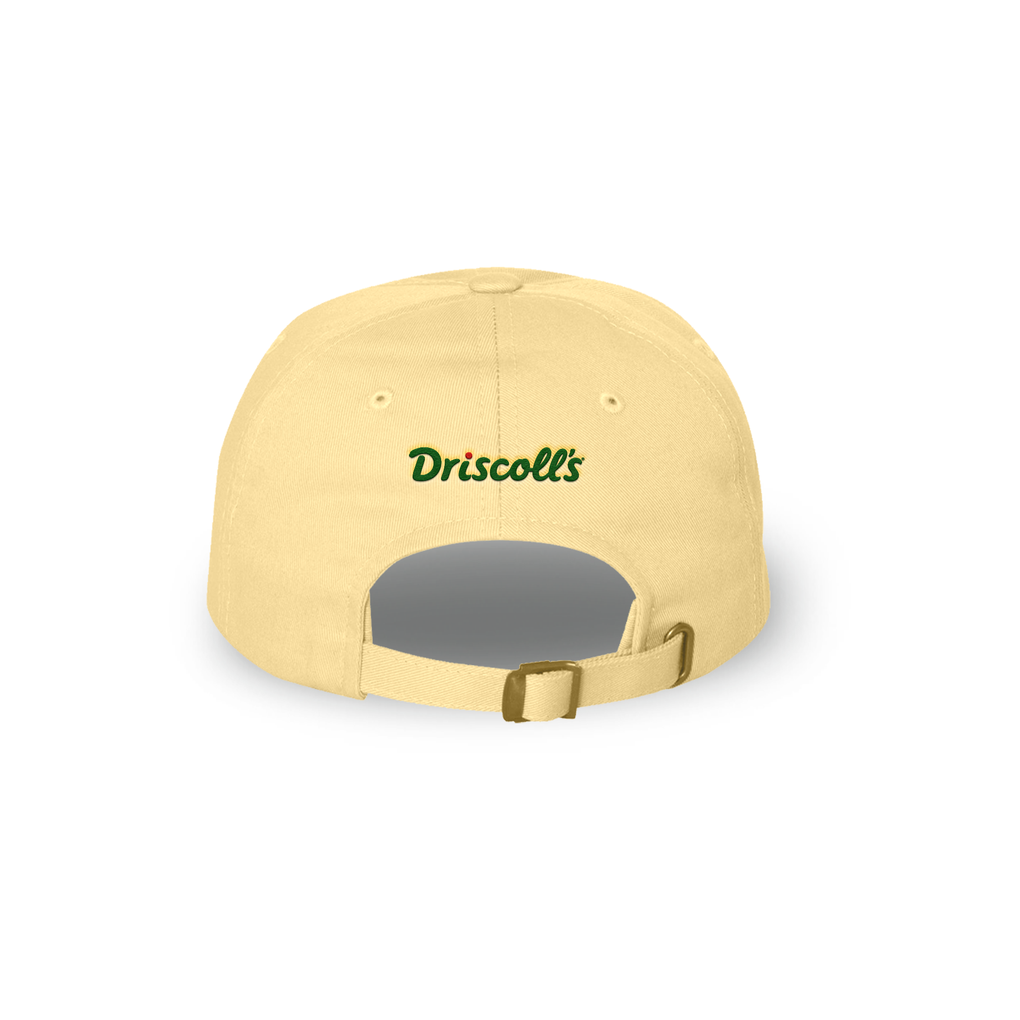 • Back of yellow hat with Driscoll's printed over the adjustable opening
